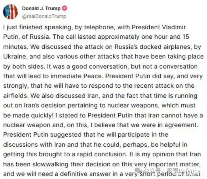 稍早一些,特朗普还在社交媒体上发文称他再次俄罗斯与俄罗斯总统通电话,两人谈及了最近发生的机场袭击事件,“普京总统非常强烈地表示,他必须对此做出回应”。