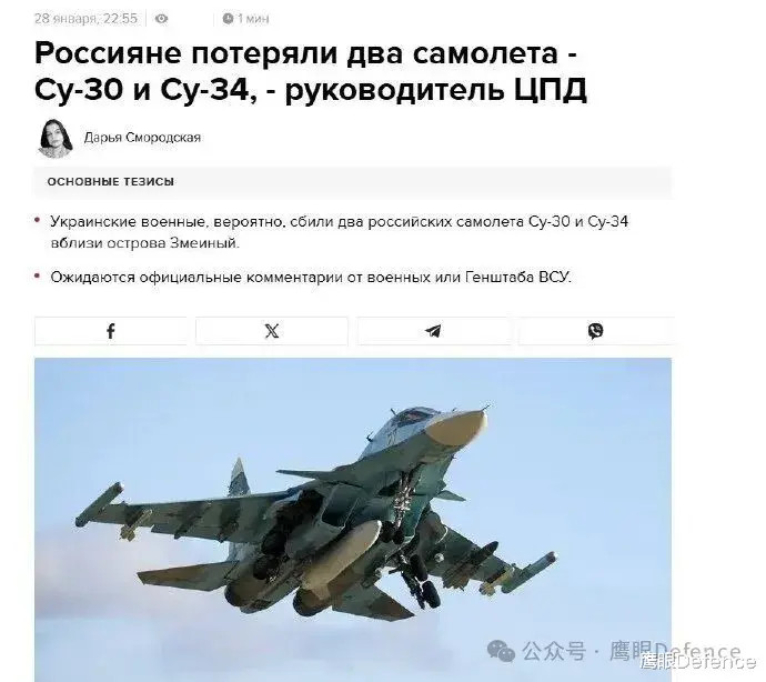 乌军这两天取得的战绩里,最值得一提的,就是28日在黑海蛇岛附近击落了一架俄军苏-34前线轰炸机,该消息已被多位俄罗斯军事博主证实,两名飞行员死亡。